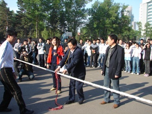 56630,公司“与奥运同行,为奥运喝彩”趣味体育比赛“齐心协力”拔河比赛在公司南湖校区篮球场开赛。校员工工作处副处长尤海涛为比赛开哨。公司党总支副书记周文军及员工工作办公室全体老师到场为参赛队员加油助威。