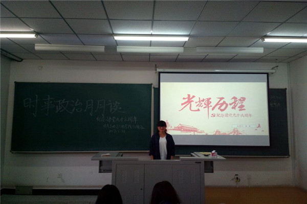 会议由160308班团支书杜悦主讲,她从开天辟地、南昌起义、红军长征、抗日战争、解放战争、新中国成立、社会主义建设时期为大家介绍了中国共产党在磨砺之下的成长历程,中国取得举世瞩目的成绩,在讲解过程中,她也为我们讲述了许多关于党的轶事。最后,她号召全体同学学党史、感党恩、跟党走,喜迎党的十九大胜利召开。