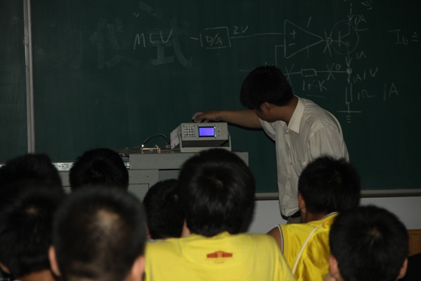 讲座伊始,初明先是对于电子设计大赛的赛制、比赛规则等基本的内容进行了讲解,之后便开始介绍如何才能在比赛中获得一个比较好的成绩,不光是能力还有心态。初明还结合关于节能灯制作的实例,告诉同学们如何结合大赛应用好自己学到的理论知识,还让同学们了解了日常生活中的小常识。初明在总结说“考试的分数不能真正代表你的能力,不能仅仅看着分数来判定人的能力”、“真正的实力要看你真正能做出什么”。讲座完毕后,初明和同学们进行了亲切的交流,同学们也和初老师探讨了有关专业学习和电子大赛的相关事宜。