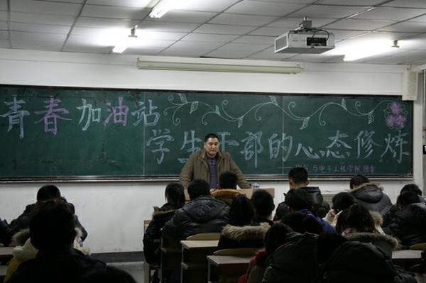 培训中,郑老师通过诙谐幽默的语言以及富有寓意的小故事向同学们讲述着良好心态对员工干部的重要性,他说:“没有好的心态就难以承受工作的压力,没有好的心态就难以完成自我的提高,没有好的心态就难以创造优秀的工作成绩。”郑老师从生活、工作、待人处事等几个方面向大家介绍了什么是阳光心态,并从“改变对事情的态度”、“享受过程,活在当下”等七个方面告诉大家怎样塑造阳光心态。接着,由一个“你是否是一个拥有阳光的心态的人”的提问进入 “阳光心态测试”部分,使同学们陷入思考。思考过后,郑老师又向同学们介绍了“感恩心态”“零度心态”“积极心态”“执著心态”和“共赢心态”。他表示,员工干部只有具备了这些心态,才能使自己的内心充满能量、释放能量,并更好的为同学们服务。