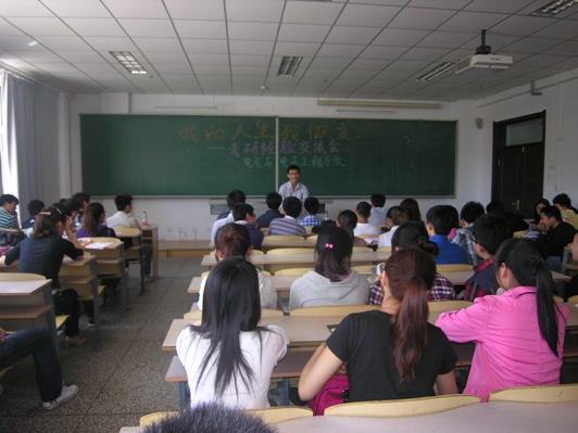 | 公司举行“我的人生我做主”考研经验交流会 为了使同学们更全面地认识当前考研情况,提供成功的考验经验,让他们能够准备得更加充分,并解决他们可能或已经遇到的一些问题。5月11日中午12时45分公司在南湖校区科研楼316教室举行“我的人生我做主”考研经验交流会,公司员工党支部书记赵爽、辅导员朱博老师和公司2008级、2009级有考研意向的同学参加了交流会。