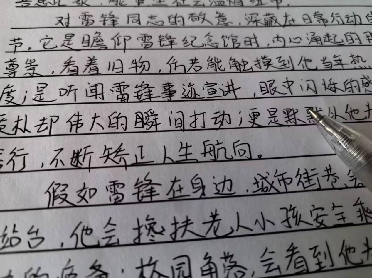 这一行行整洁的字体是同学们对雷锋的深切缅怀,每一笔都饱含着对其精神的深刻领悟,写下了的是对雷锋精神的真切传承,是对雷锋精神的真切传承,通过文字倾诉对雷锋一生的无私奉献,续写温暖人间的篇章。以纸笔为媒,立志践行雷锋精神。