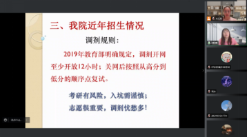 会议伊始,朱宏殷老师简明介绍了本次会议的主旨和参会人员,在大家的热切期盼中,刘经理详细介绍了近三年本公司研究生招生、报考和录取等情况,8名受邀优秀毕业生依次分享了自己的实习、就业、考研和调剂等宝贵经验。
